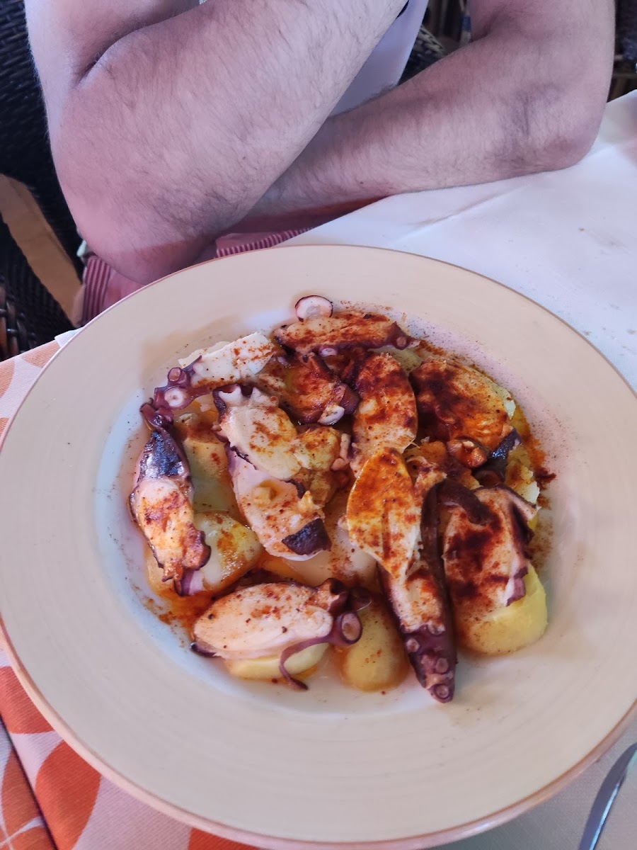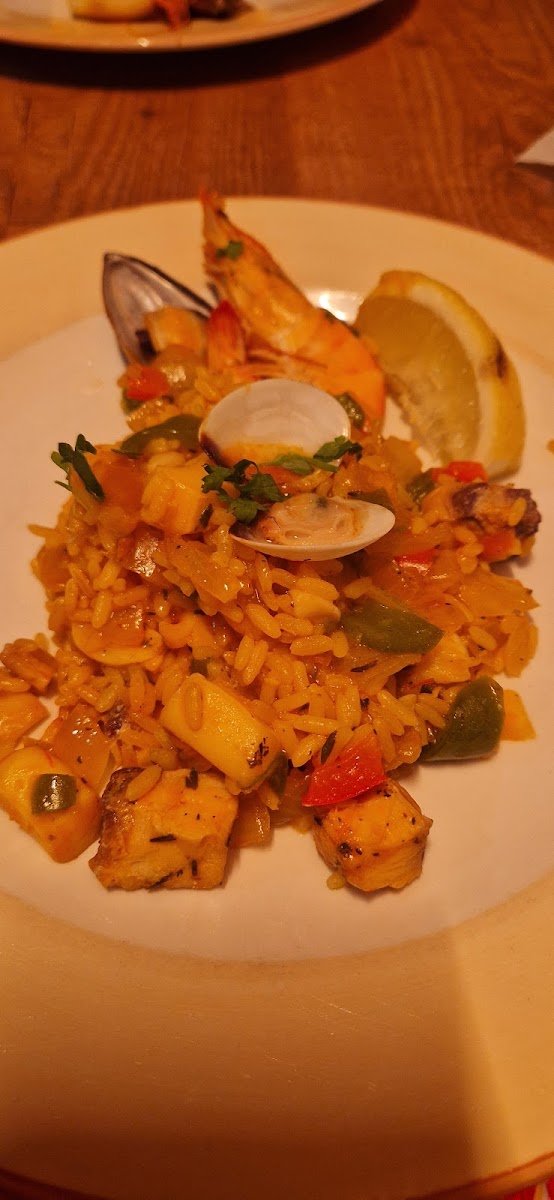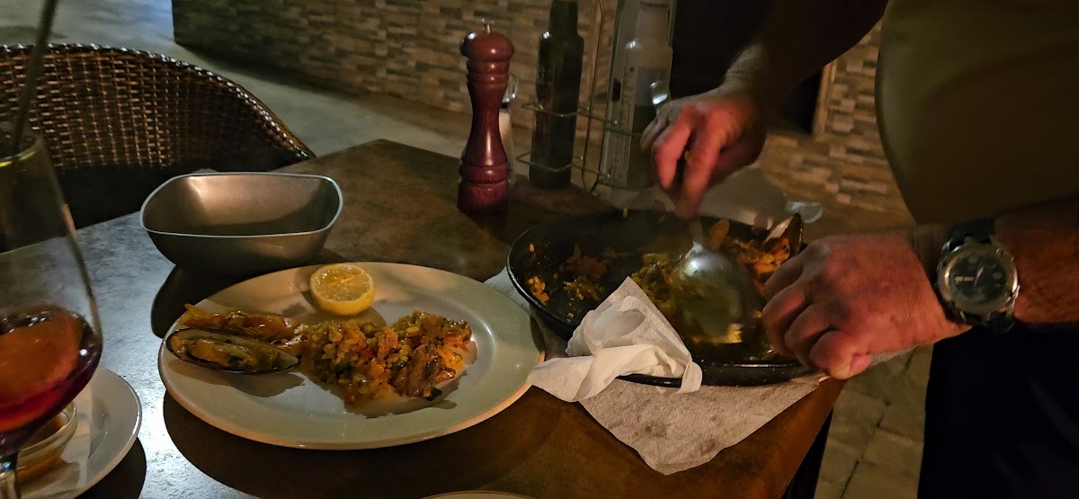 The paella was fantastic and reasonably priced. I took the photo while it was being served by the waitress so you don’t see how rich in seafood it was. Prawns with garlic and oil were great. Olives very very good, though pricey. We were super happy with the food and service and will come back.
